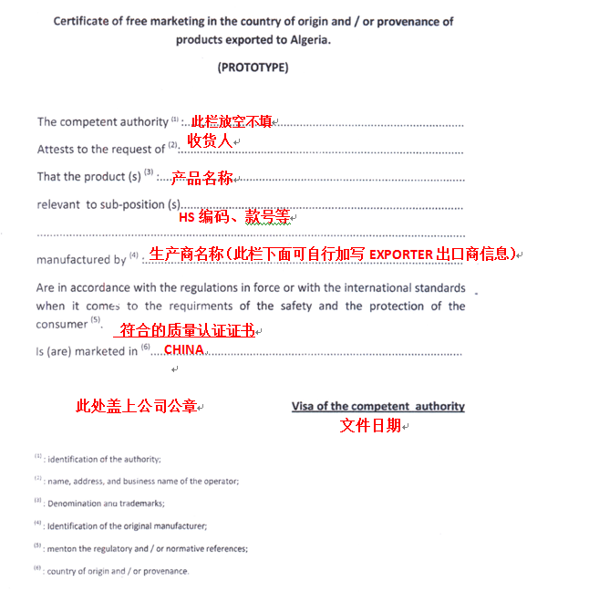 根據(jù)阿爾及利亞方2018年1月7日新規(guī),所有出口到阿爾及利亞的產(chǎn)品,都要先在出口國做自由銷售證明,現(xiàn)將該文書格式填寫要求和需要提交材料通知如下: