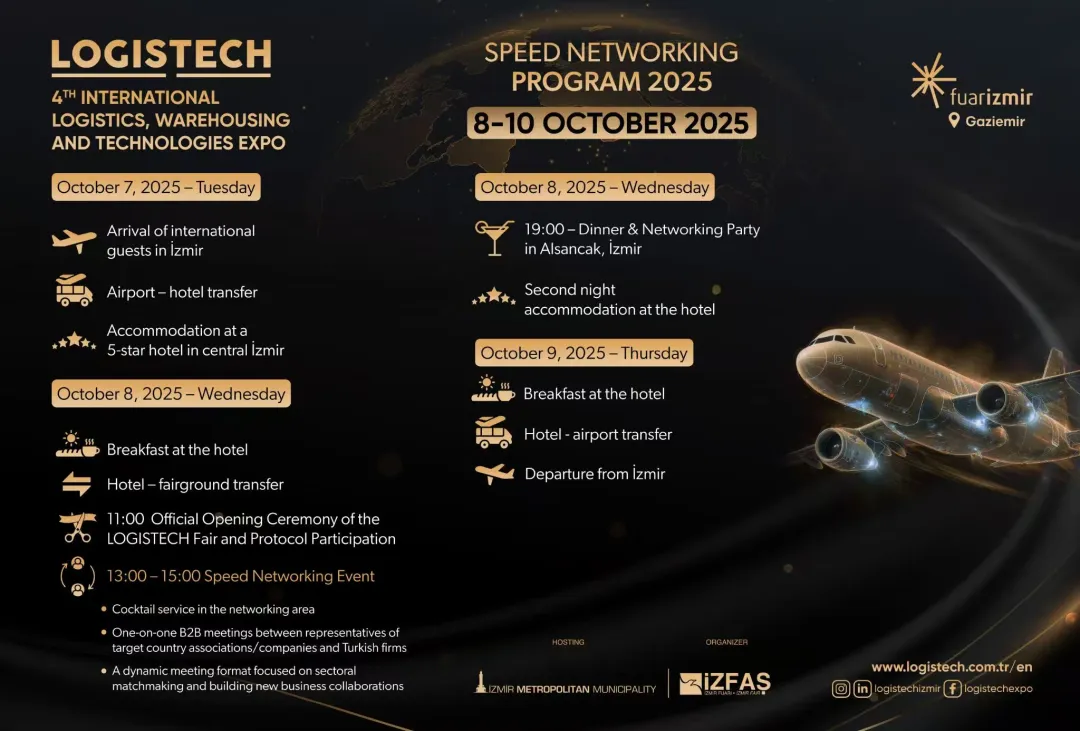當(dāng)前物流產(chǎn)業(yè)正經(jīng)歷快速迭代升級(jí),新技術(shù)、新業(yè)態(tài)不斷涌現(xiàn)。受我會(huì)友好協(xié)會(huì)——土耳其愛(ài)琴海出口商協(xié)會(huì)委托,現(xiàn)誠(chéng)邀各有關(guān)企業(yè)參與2025年10月8-10日在土耳其港口城市伊茲密爾市舉辦的“第四屆國(guó)際物流、倉(cāng)儲(chǔ)與技術(shù)博覽會(huì)”(LOGISTECH - 4th INTERNATIONAL LOGISTICS, WAREHOUSING AND TECHNOLOGIES EXPO)。