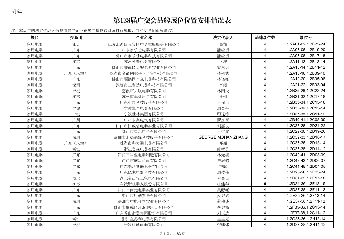 二是包含企業(yè)名稱(chēng)、法人、展位號(hào)等信息的品牌展位位置安排情況表,公示網(wǎng)址為:https://www.cantonfair.org.cn/zh-CN/posts/913001623553708032,公示期至7月30日18時(shí)。